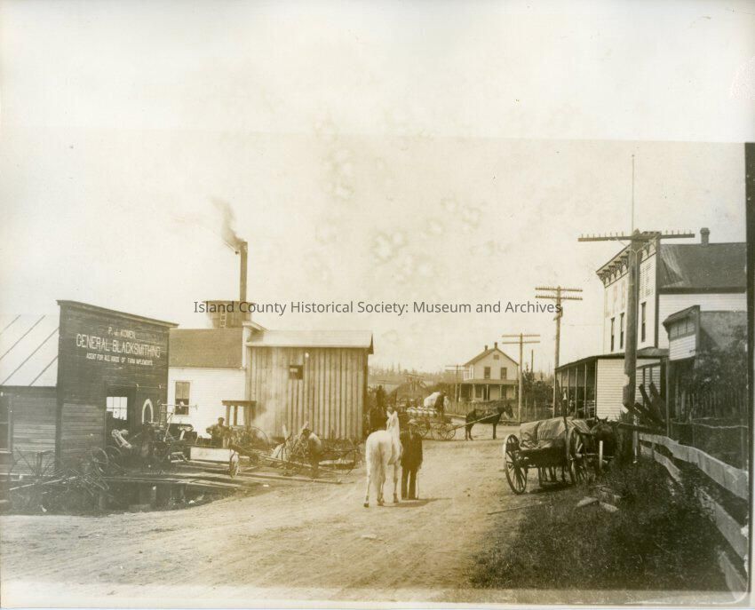 The town of Oak Harbor, several workers can be seen outside the shops. In the center of the street is Donald O'Leary and his horse Sneezy.