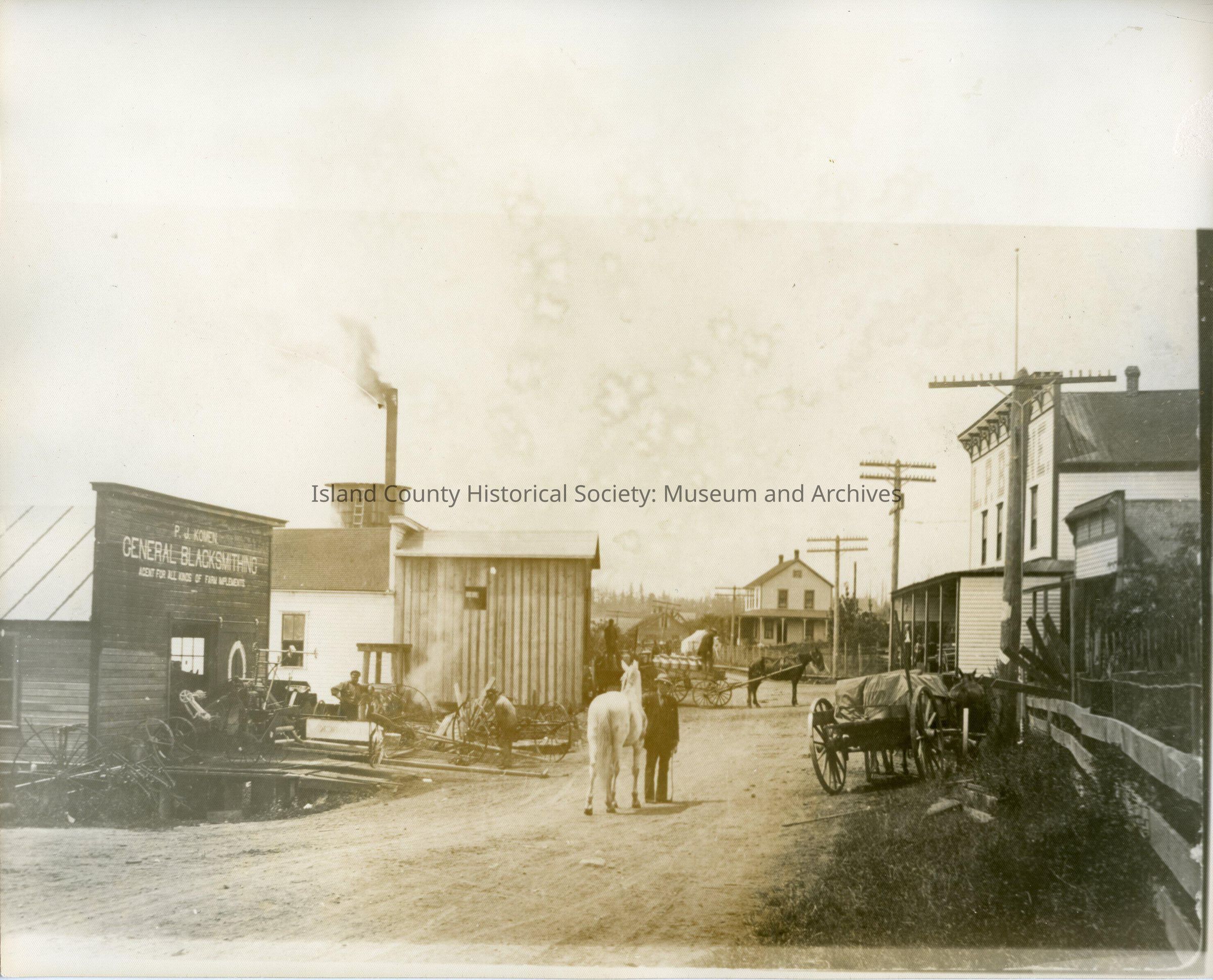 8" x 10" sepia tone photo of downtown Oak Harbor. Donald O'Leary and his horse Sneezy in foreground. c 1890