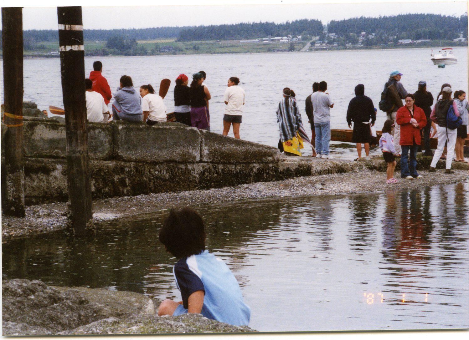 May 17, 2004 Coupeville Water Festival. At Coupe Park beach access. People on the boat ramp and a boy in a bllue shirt playing along the shore in the foreground. Launched a canoe. Chase boat in the background.