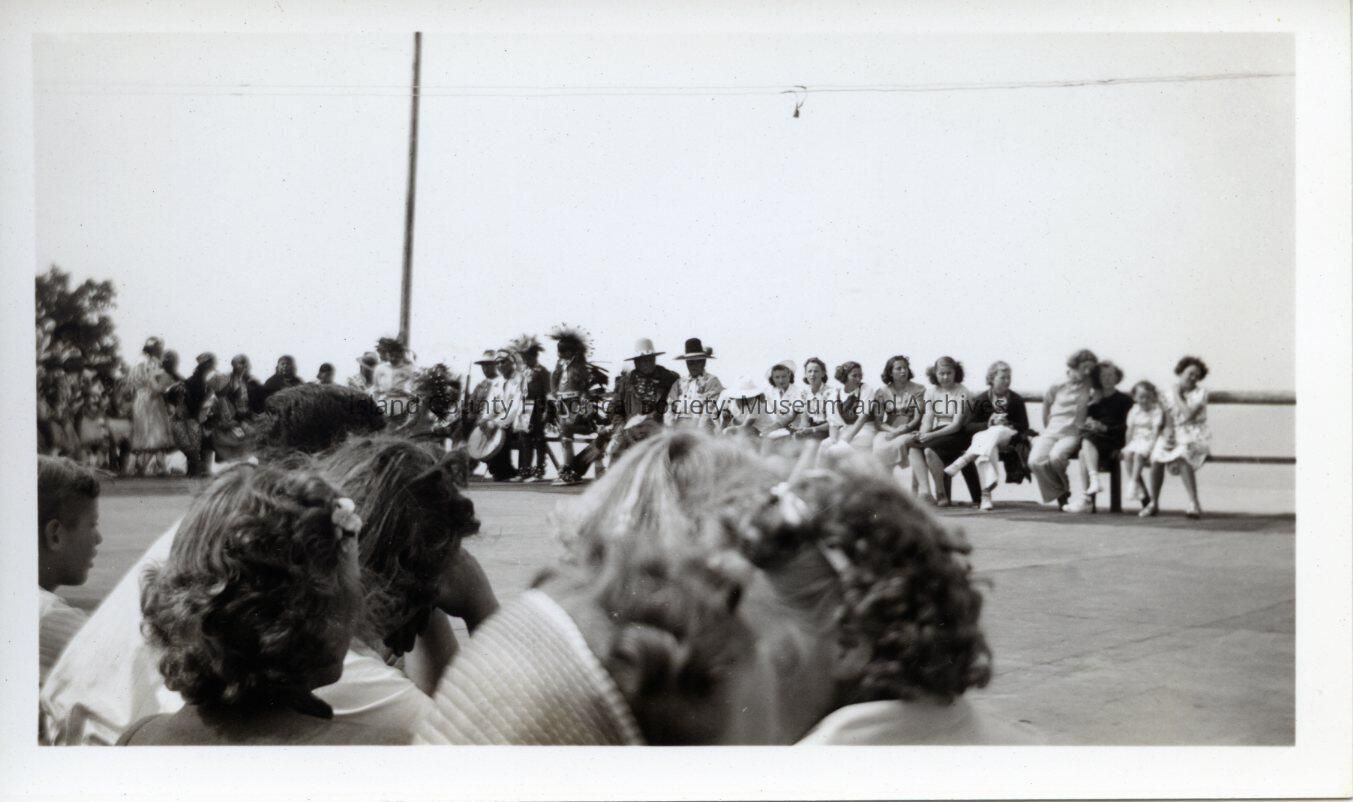 Black and white photograph of an event during the 1939 water festival. People are seated around three sides of an open cement/tarmac space. A few Native Americans are in the center background. A bunch of girls sit alongside them towards the right of frame. The photo is taken over the heads of a few women.