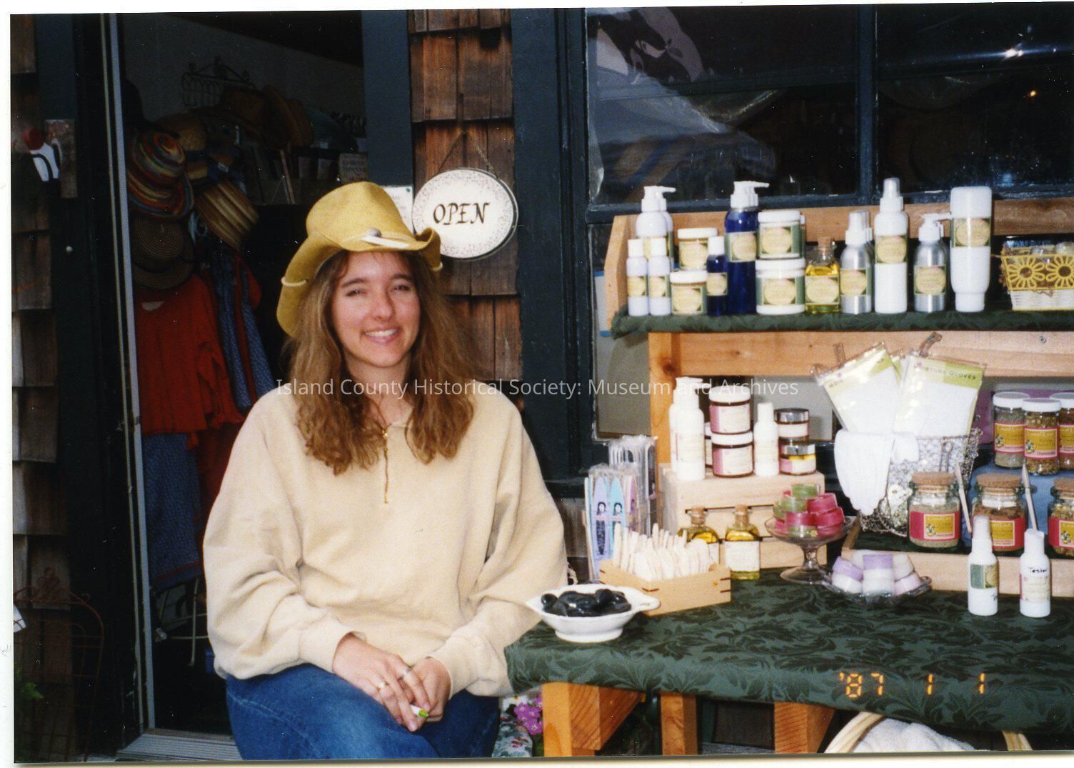 May 17, 2004 Coupeville Water Festival. Young woman, wearing a cowboy hat, sitting at a vendor table in front of what is now the Consignment Shop on Front Street.Collection