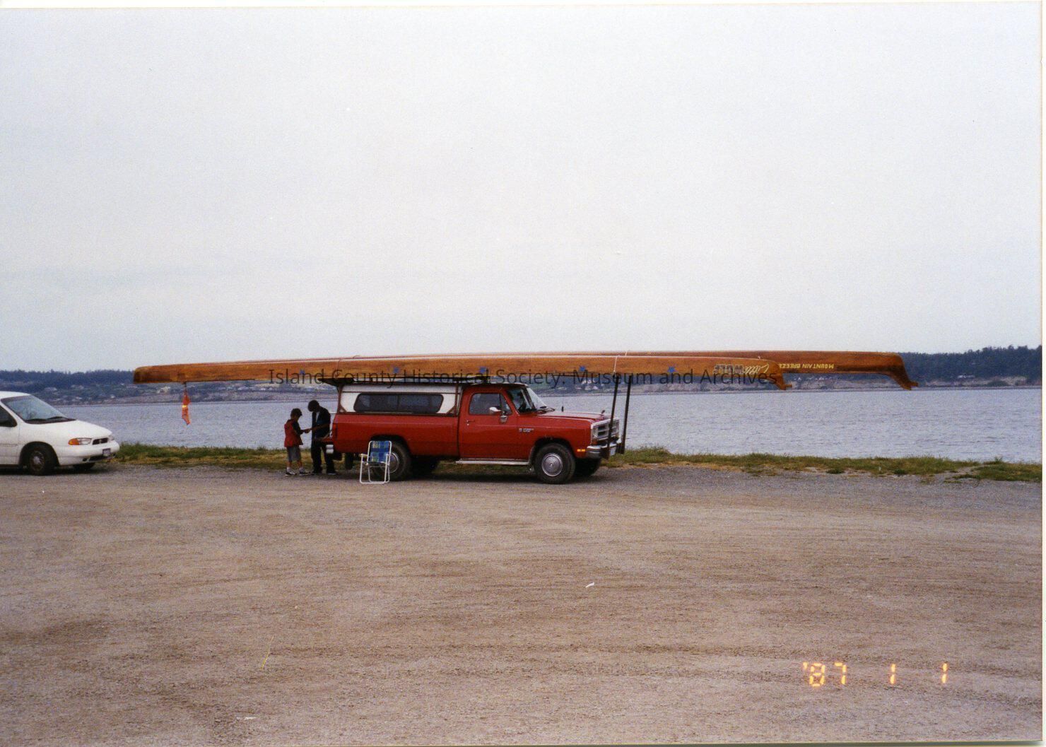 May 17, 2004 Coupeville Water Festival. Red pickup truck carrying two canoes upside down. At Coupe Park boat access.