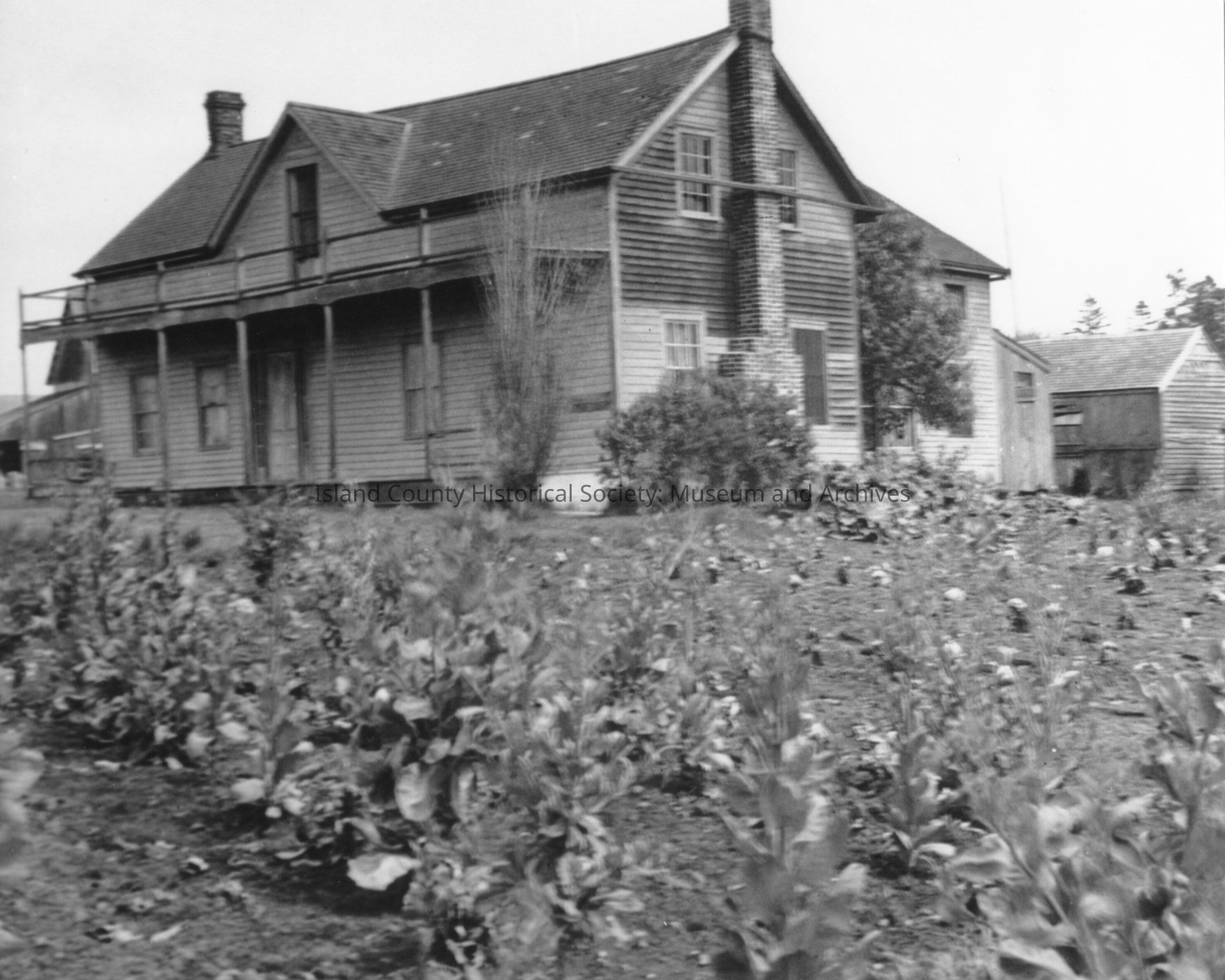 Front view of Ebey's Prairie Ferry House surrounded by overgrown yard.