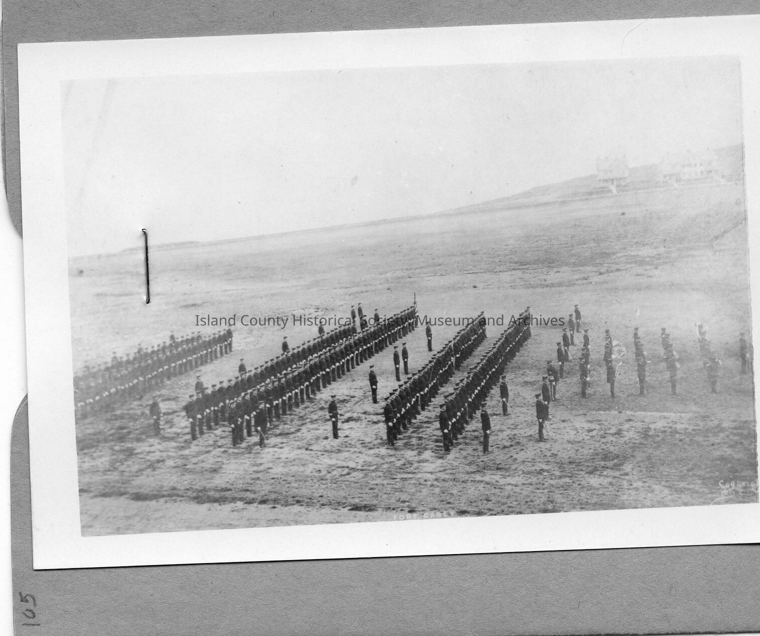 photo with negative: Evening retreat 1910 Fort Casey Parade grounds. Camera facing north. Officers Row and Juan de Fuca in the background.