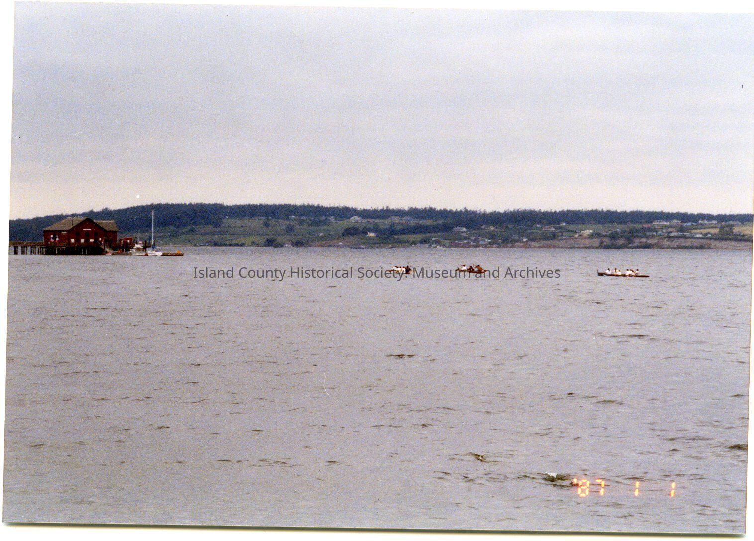 May 17, 2004 Coupeville Water Festival. From Coupe Park beach access. Canoe race underway. Looking towards the Coupeville wharf.