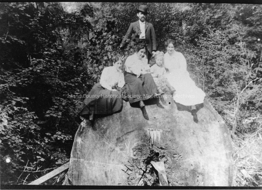 Historic photos from Coupeville Examiner Three women and one small girl sitting on a very large tree log behind them a man is standing