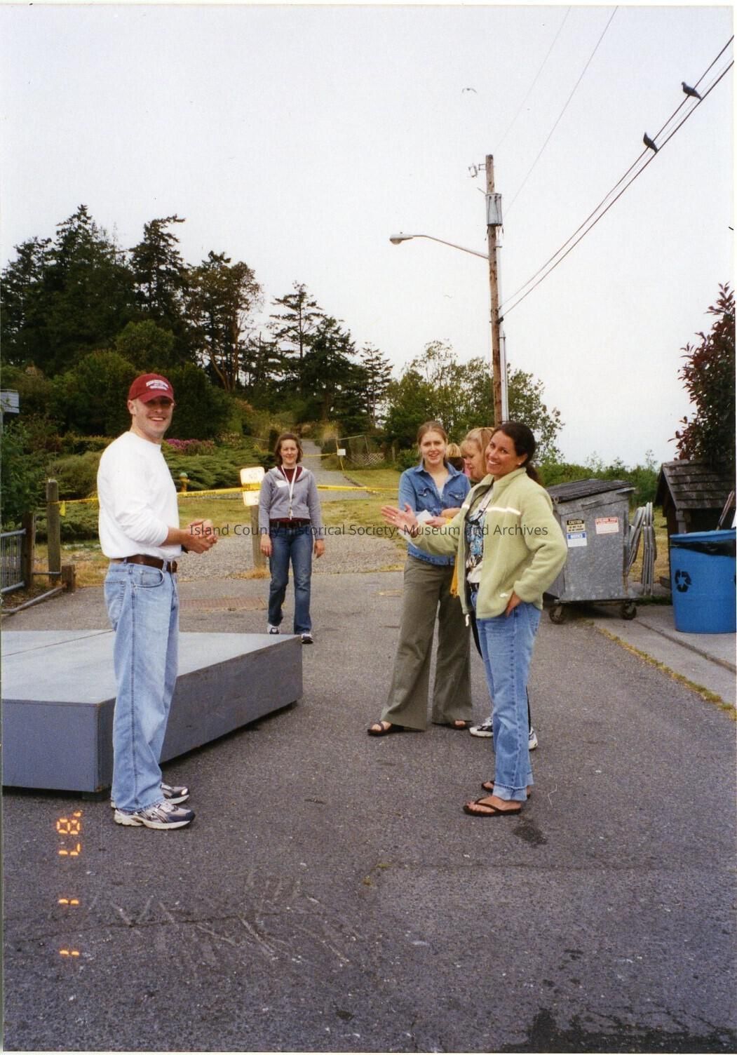 May 17, 2004 Coupeville Water Festival. People standing on Front Street near the museum ready to set up. The woman in the green jacket is Cindy Gass-Johnson. Julie Dougherty Winger is in the wide legged brown pants.