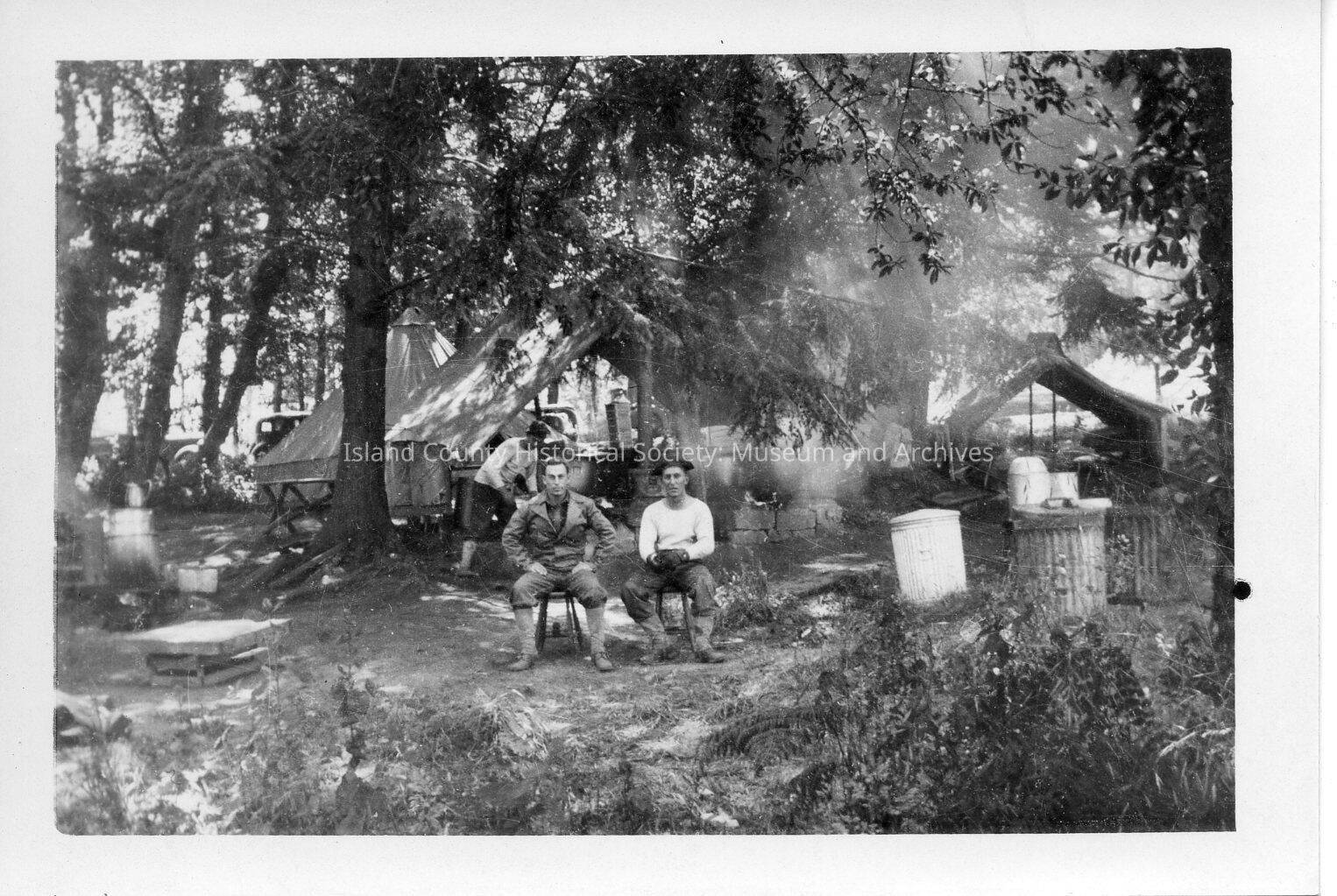 Photos of Fort Casey and soldiers. Tents in the woods, campfire.