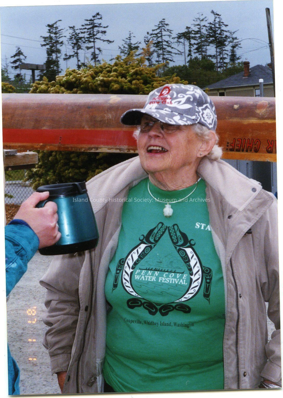 May 17, 2004 Coupeville Water Festival. Woman wearing blue and white baseball cap, green t-shirt with a design standing in front of a canoe on a vehicle at Coupe Park beach access. Someone off camera is holding a blue coffee thermos.Collection