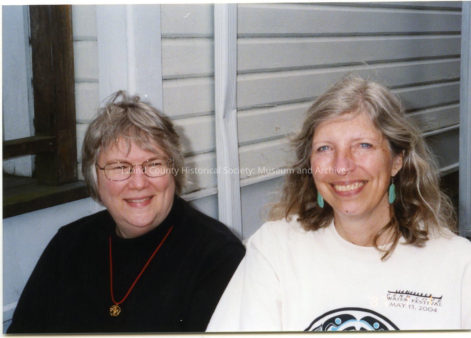 May 17, 2004 Coupeville Water Festival. Two women seated smiling at the camera. The one on the left is wearing a dark top and glasses, the other is wearing a Water Festival T-Shirt.Collection
