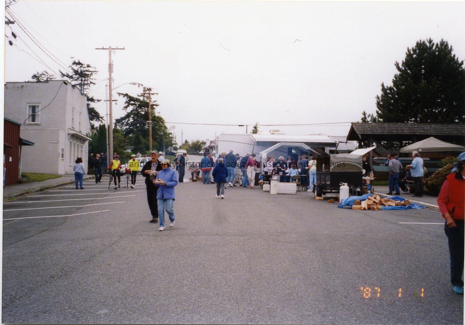 May 17, 2004 Coupeville Water Festival. View looking up Alexander Street in front of the museum. Tents and people. The old Coupeville Fire House can be seen to the left and the roof of the Canoe Shed on the right.
