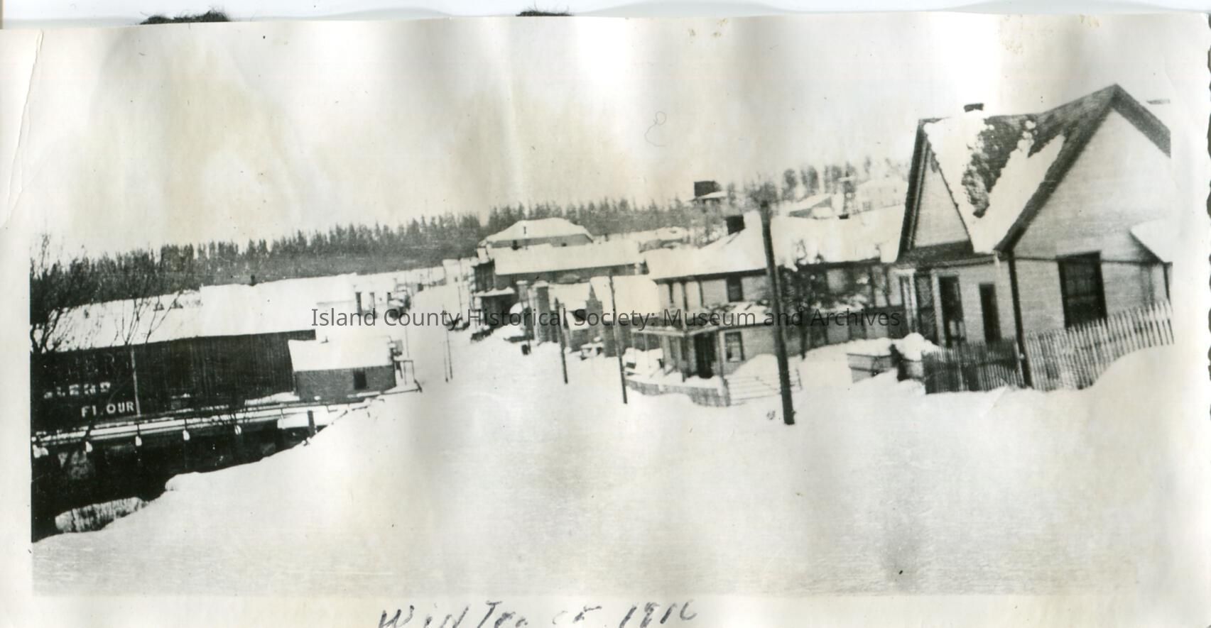 View of snowy Front Street looking east with partial view of the wharf and water tower in the background. Winter 1916