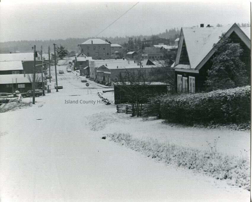 A snowy day in Coupeville. On the right is a hedge in front of a dark house with snow on the roof. In the background on the right side is a row of buildings, with a very large one in the background. On the left side is a car parked along side of a dark building, followed by more buildings along the road.Written on the back. "After 1968 when Block House Inn burned"