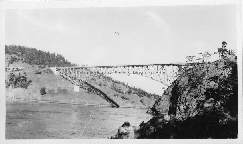 Photograph of Deception Pass Bridge, from Whidbey Island at sea level. Written on back: "13". Given by Anna K. Eason, daughter of Sterling E. Anderson, who took the photos.