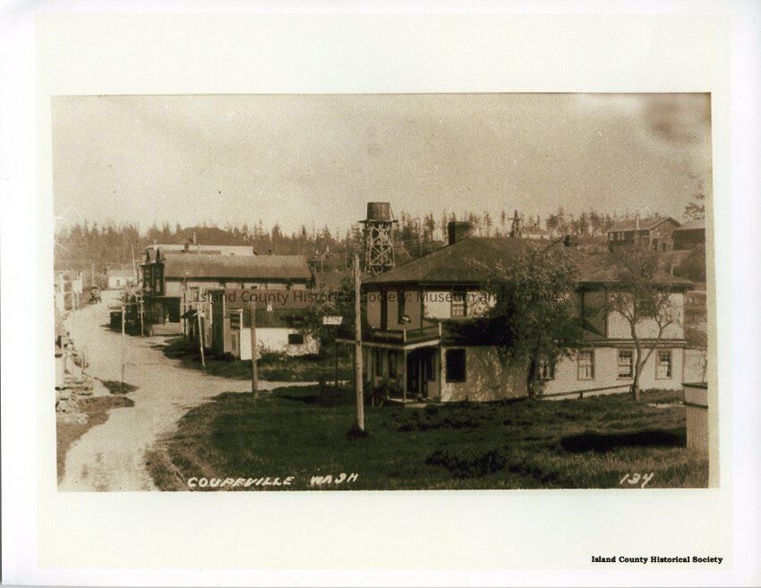Copy of a photo of downtown Coupeville, Wash. Island County Historical Society printed on lower right of photo.