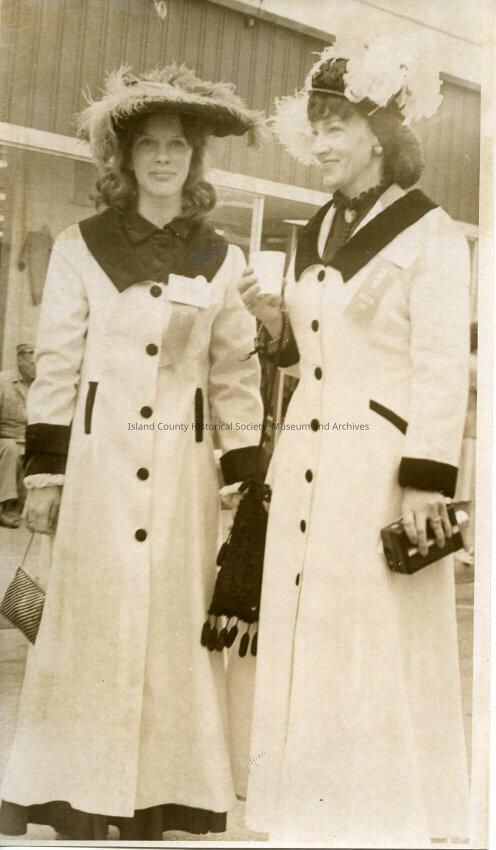 Historic photos from Coupeville Examiner Two women wearing matching dresses and fancy hats. Woman on the right is holding a movie camera. The photo is dated 1967.