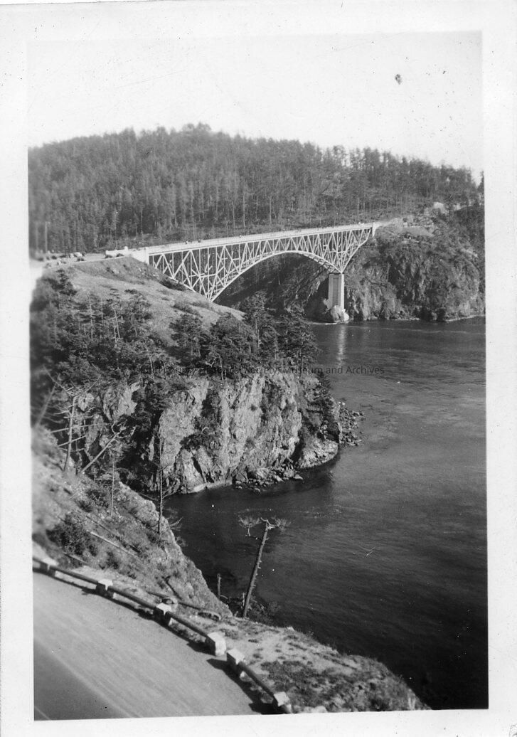 Photograph of Deception Pass Bridge. Viewed from the north lookout area on Fidalgo Island. Written on back: "July 9, 1939". Given by Anna K. Eason, daughter of Sterling E. Anderson, who took the photos.
