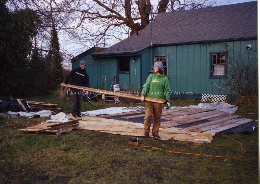 Restoration of Capt Thomas Coupe's house. Two construction workers carrying lumber. The siding of the Coupe house lays on the ground next to them.