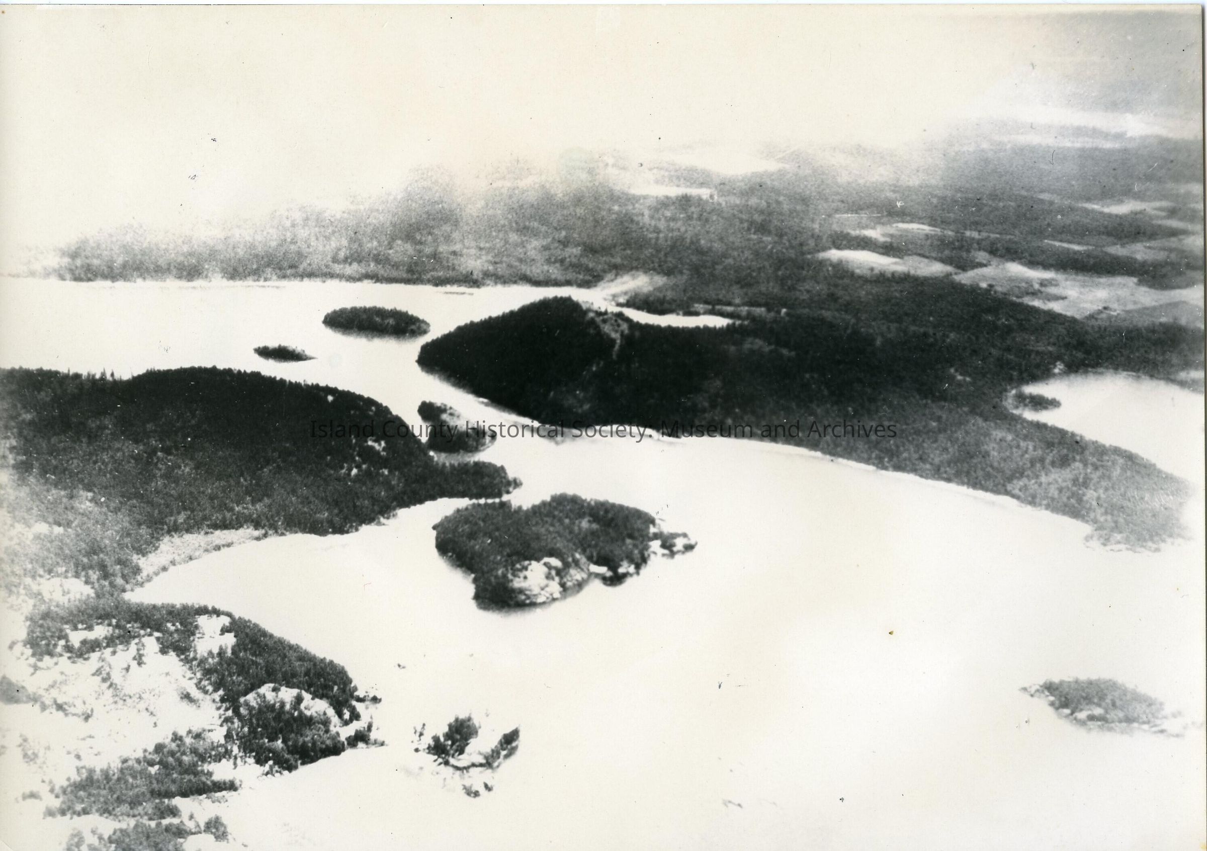 The black and white photo is an overhead view of the Deception Pass before the bridges. The photo shows various size islands.