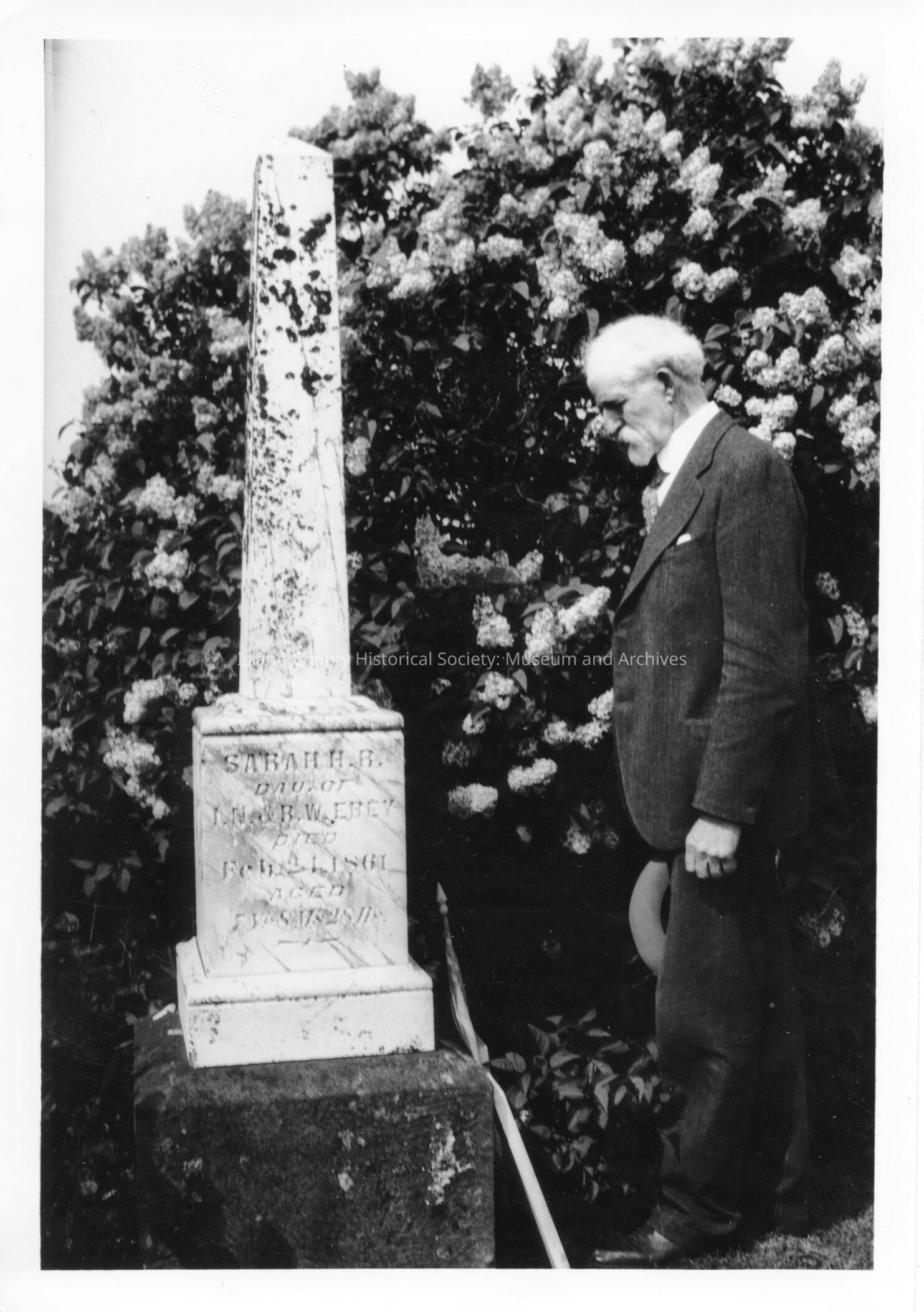 Professor Edmond S. Meany of University of Washington at grave of Col. Isaac N. Ebey's daughter, photo, 1923, Coupeville,WA