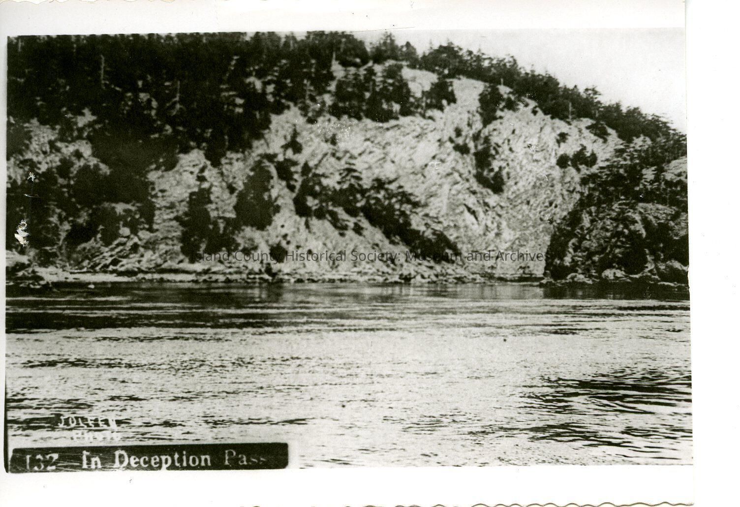 The black and white photo shows a view of Deception Pass. The bottom half of the photo is overtaken by the ocean. The top half of the photo shows a rocky landform with several trees.