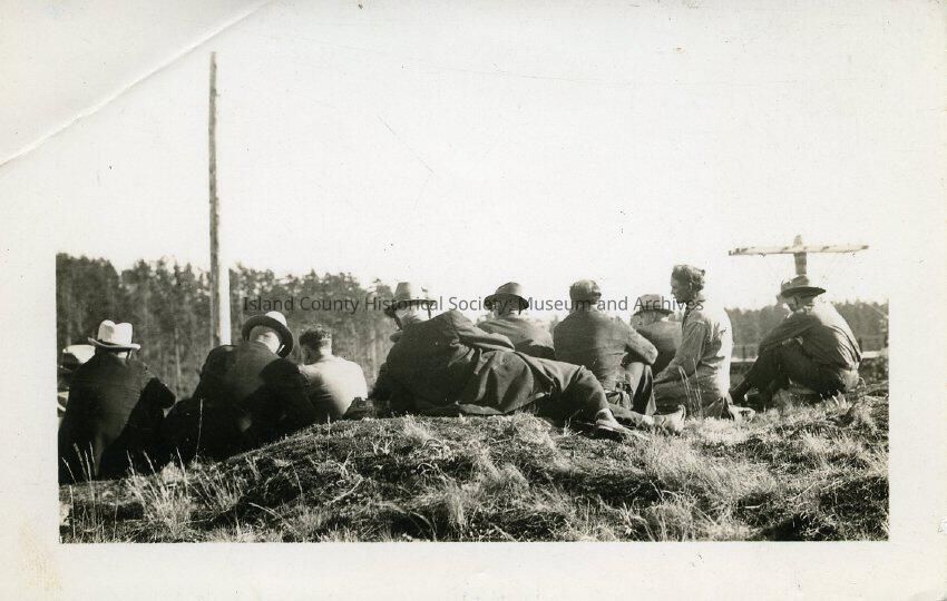 This black and white photo shows the Deception pass bridge committee sitting around for a group photo. The committee is facing away from the camera. To the left there is a post and trees in the distance.