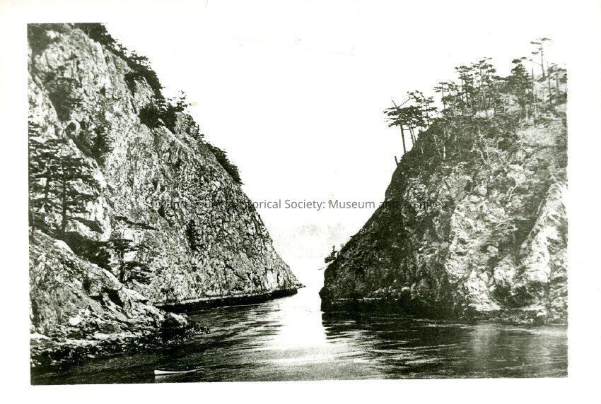 The black and white photo shows a view of Deception Pass. The bottom of the photo shows a view of the ocean the has a pathway that is continued up through the two islands in the middle of the photo. The top half of the photo shows two rocky landforms that both have trees on the tops of them and in the background there is a fading island.