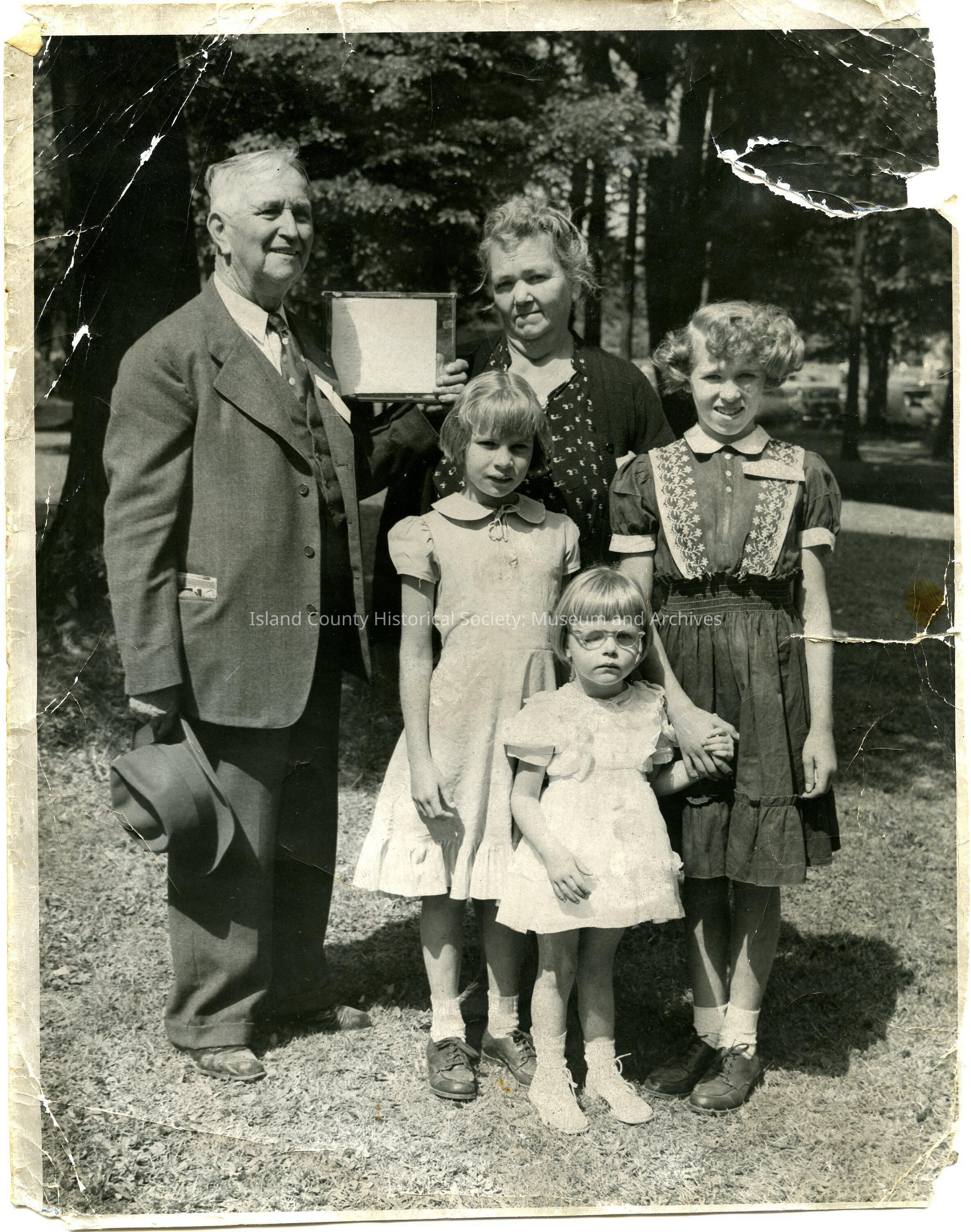 Digital only copy. Family photo. Man, woman, three girls, smallest of whom is wearing glasses/spectacles. He is holding a frame with a paper in it on his left shoulder.