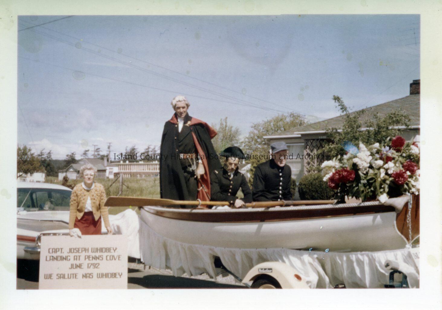 Parade float - "Capt." Joseph Whidbey landing at Penn's Cove - June 1792. Colored photo of enactment of Capt. Joseph Whidbey's Landing at Penn's Cove on June 1792. Irene Wanamaker holding sign Pat Wanamaker standing. Stan Willhight, Edwy Kennedy