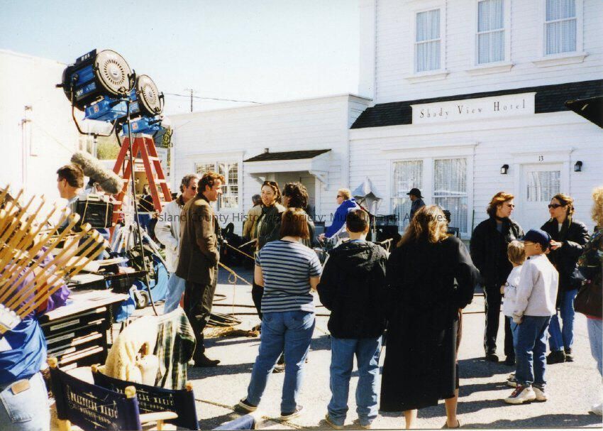 Actors and crew gathered for the filming of a movie in Coupeville. The name of the movie is unknown.