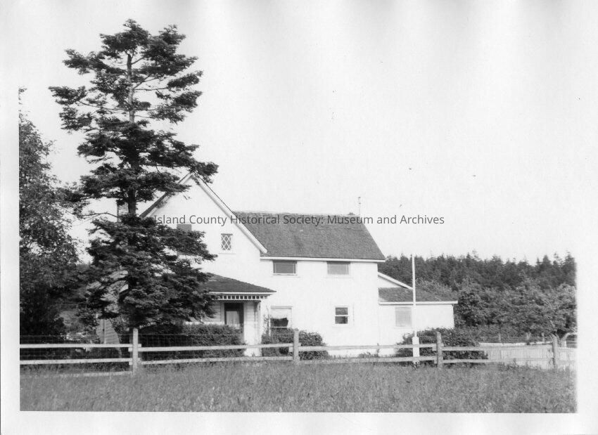 Large white house surrounded by fence. Back of photo reads: Mr. Strong lived in this house for years before he died in 1938. 707 N.E. Lindsey