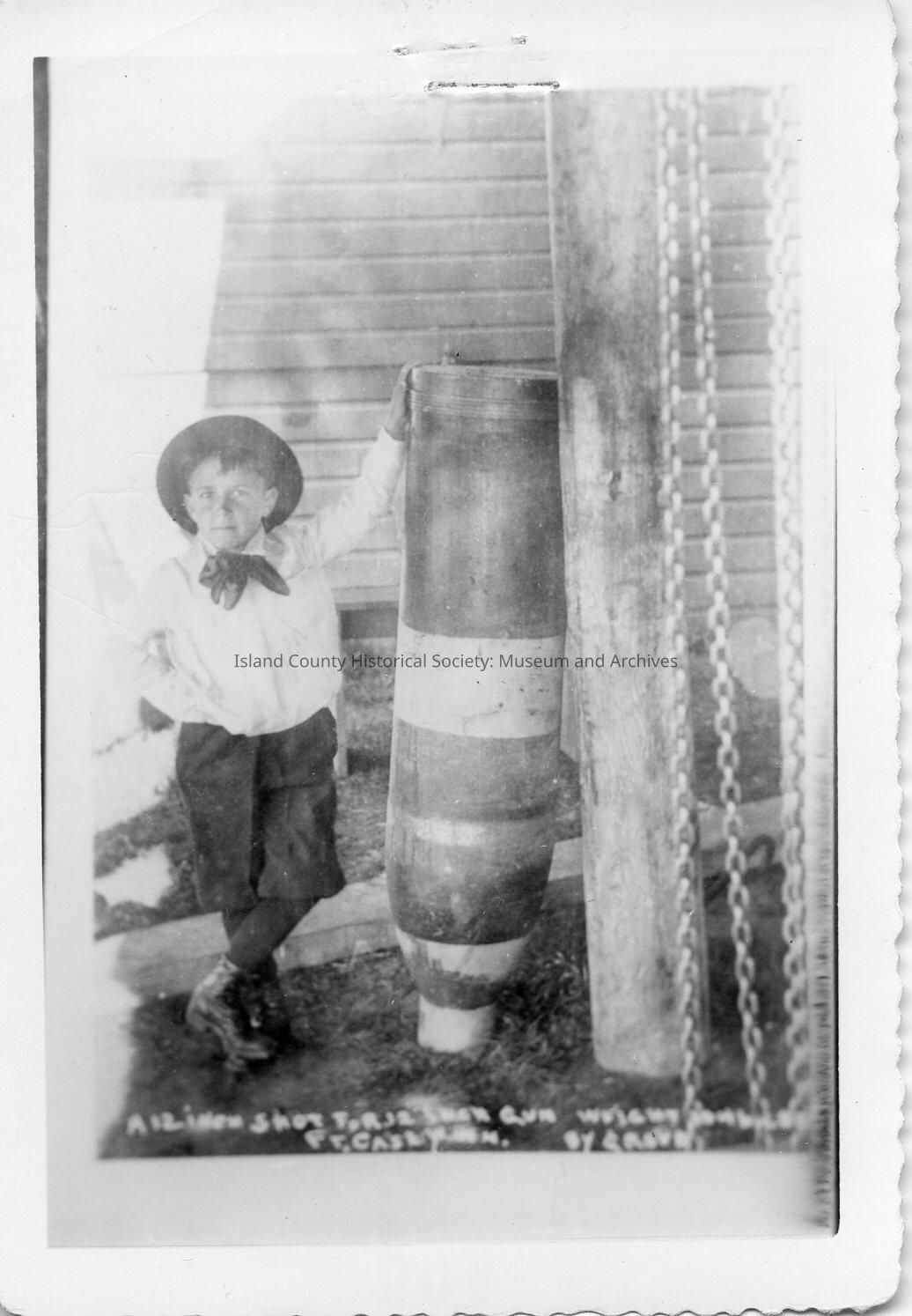 Photo of boy standing next to gun munitions. (Negative included) On the front: A 12 inch shot force ? gun (other words blurred) Ft. Casey Wash. By Grove