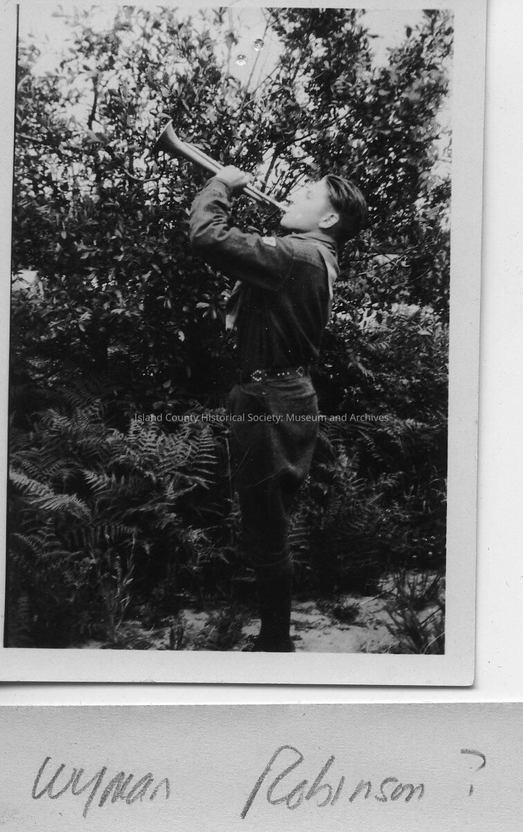 A soldier standing in some trees, blowing a trumpet or bugle. From a sticky note (now written on the back of the photo): Wyman Robinson?