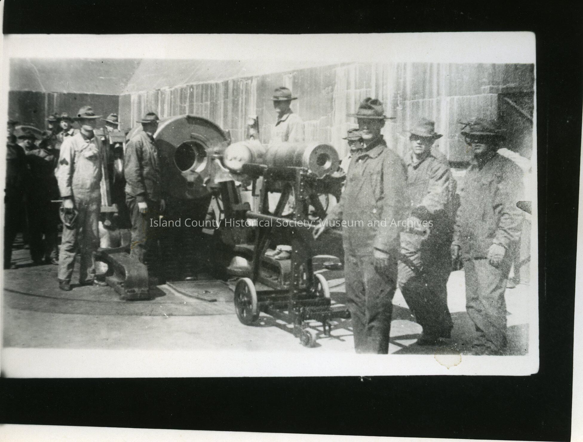 Photo of soldiers standing beside gun at Ft. Casey while it is being loaded. (Two negativevs and another, smaller print).