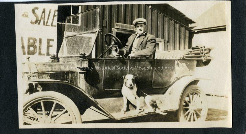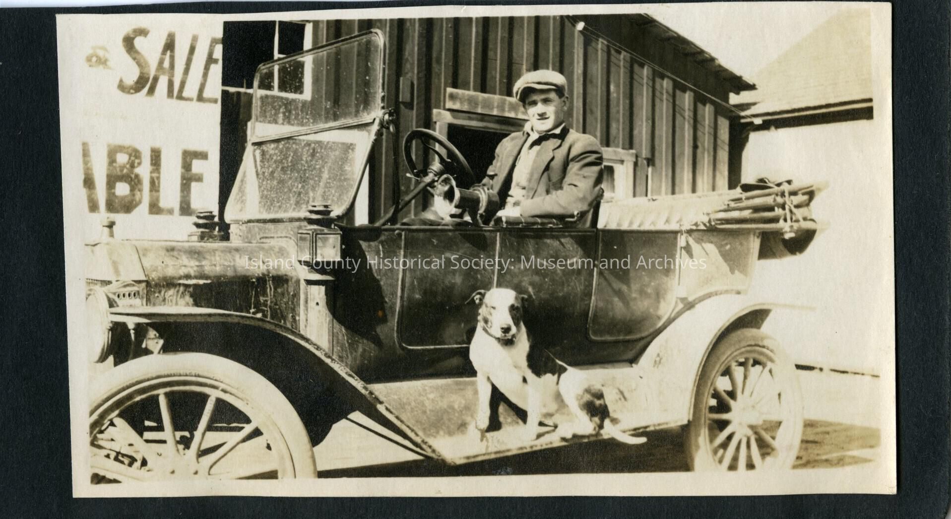 Albert Meyer of Oak Harbor sitting in an old car with a dog on the running board.