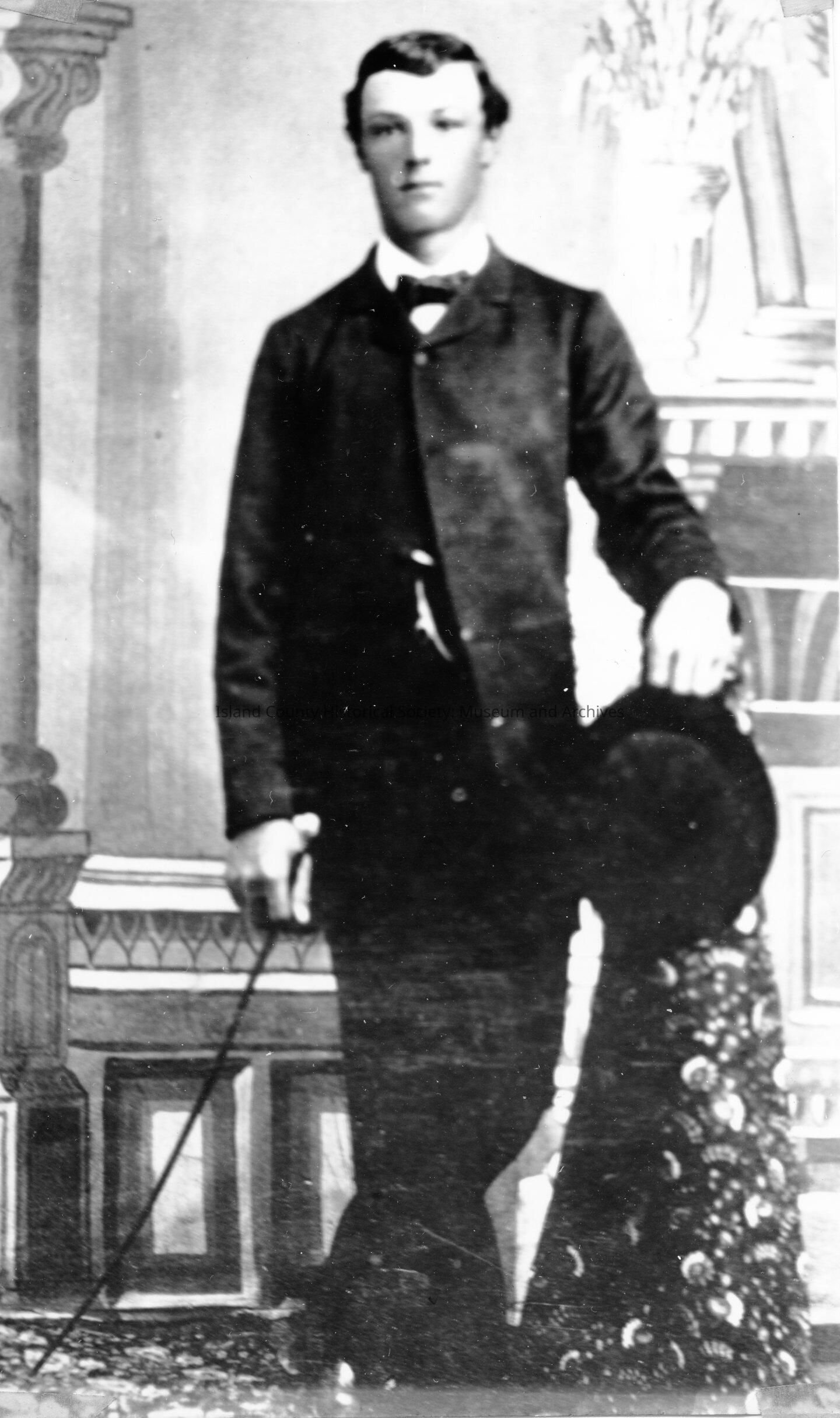 Portrait of Will Jenne, standing wearing a suit, holding a hat and a cane.