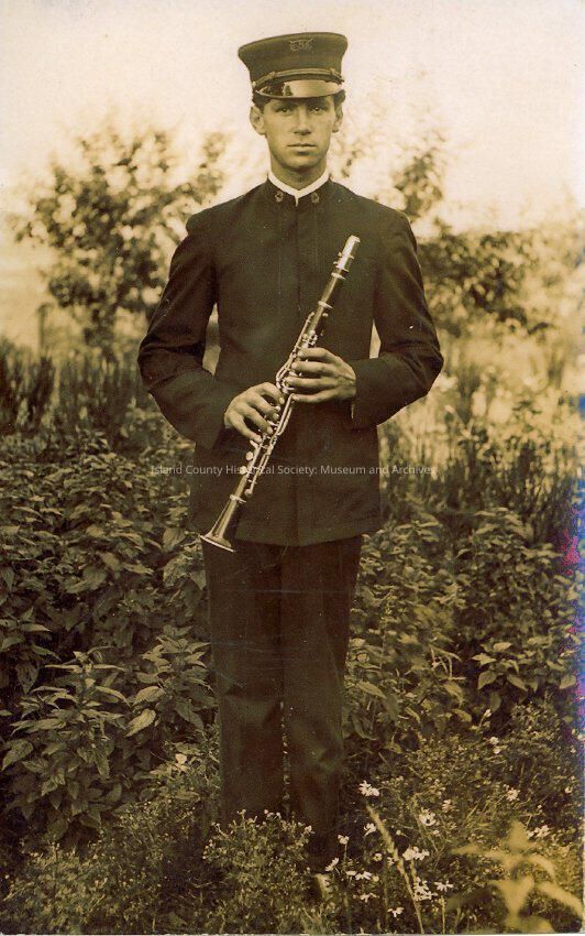 Malenus Heller Oak Harbor band member in band uniform, the uniform was dark green with black trim