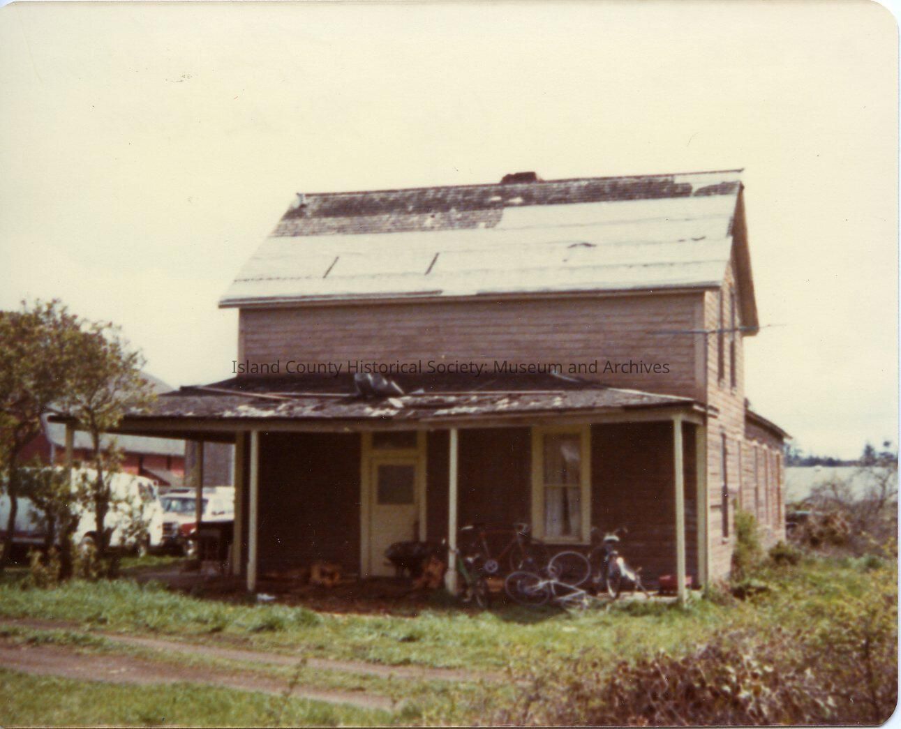Neil farm house shows covered porch with many bicycles. The home was formerly lived in by Capt Morse.