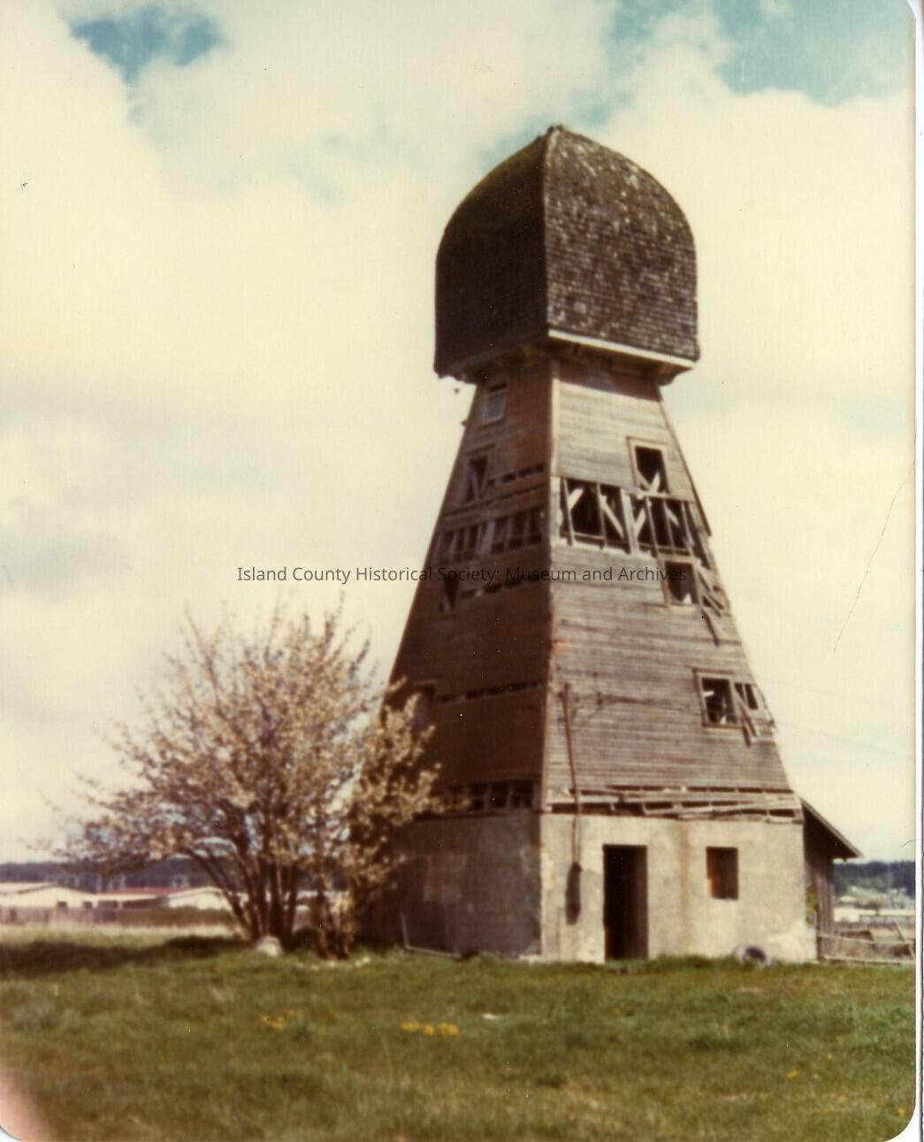 Neil water tower, weathered and missing many boards.