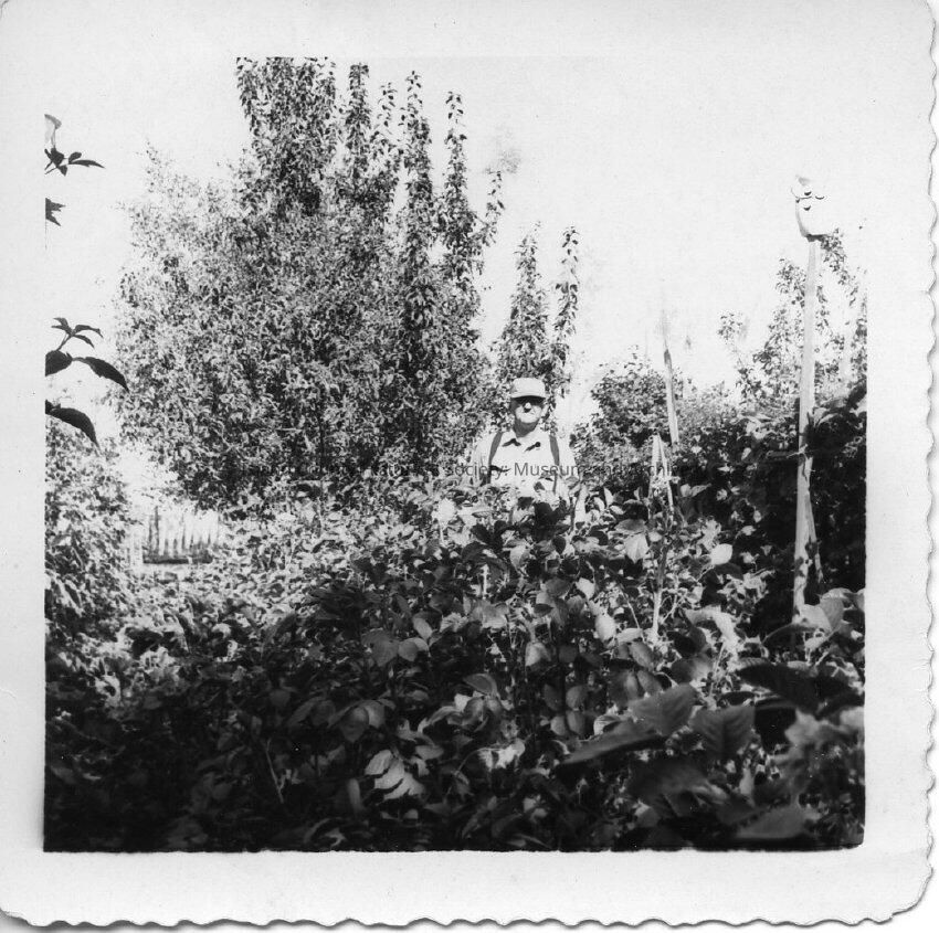 Mel Neil in his garden, surrounded by plants. Dated 7 Sep 1967.
