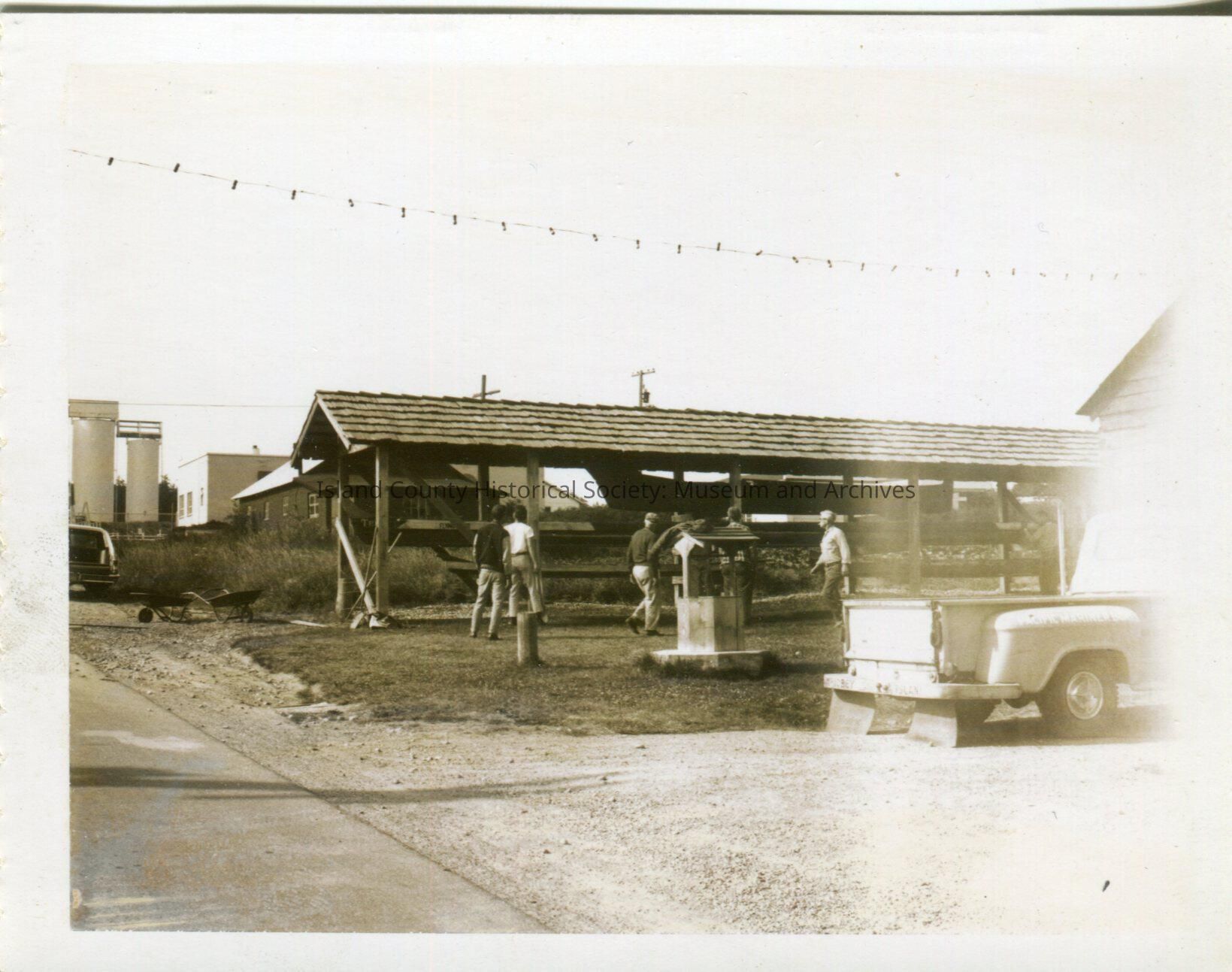 Adding a canoe to the canoe shed beside the blockhouse and museum. Workers gathered around. Pick up truck in the right foreground. Gasoline storage from Marty's garage in the background.
