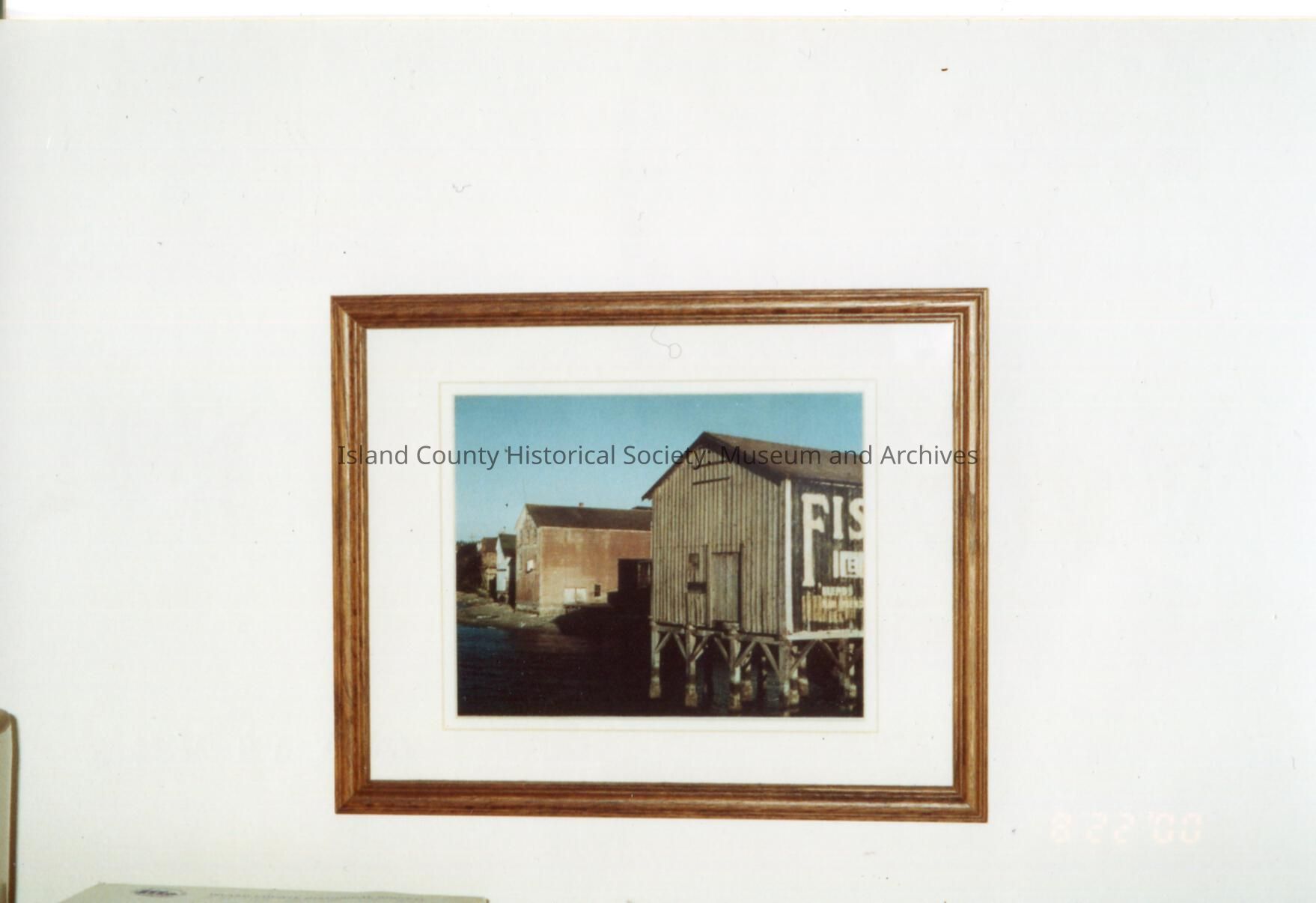 Photo of framed photograph of the water side view of Gillespie's livery with a partial view of Fishers painted on the side of the building.