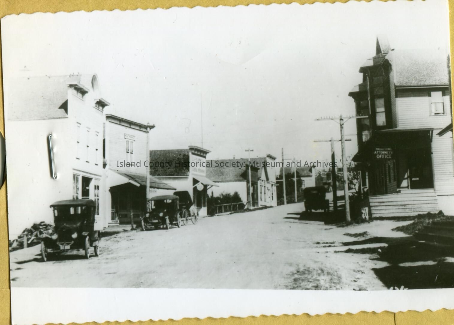 View of Front Street with Model T type cars parked in front of buildings. Telephone poles are lining the street. A building on the right: Practicing Attorney's Office.