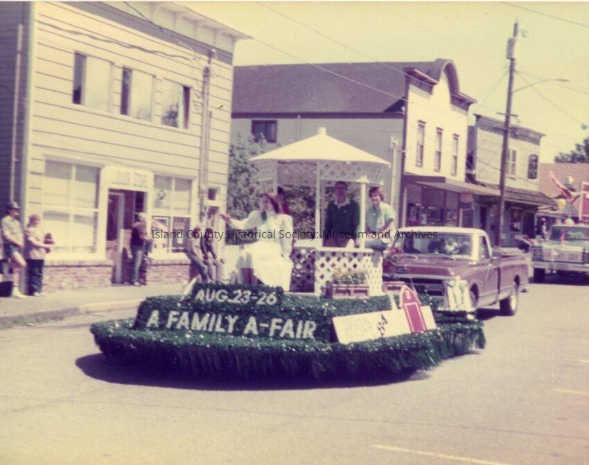 Parade in Coupeville showing a float with a gazebo on it titled "A Family A-Fair" A woman is sitting on the front of the float.