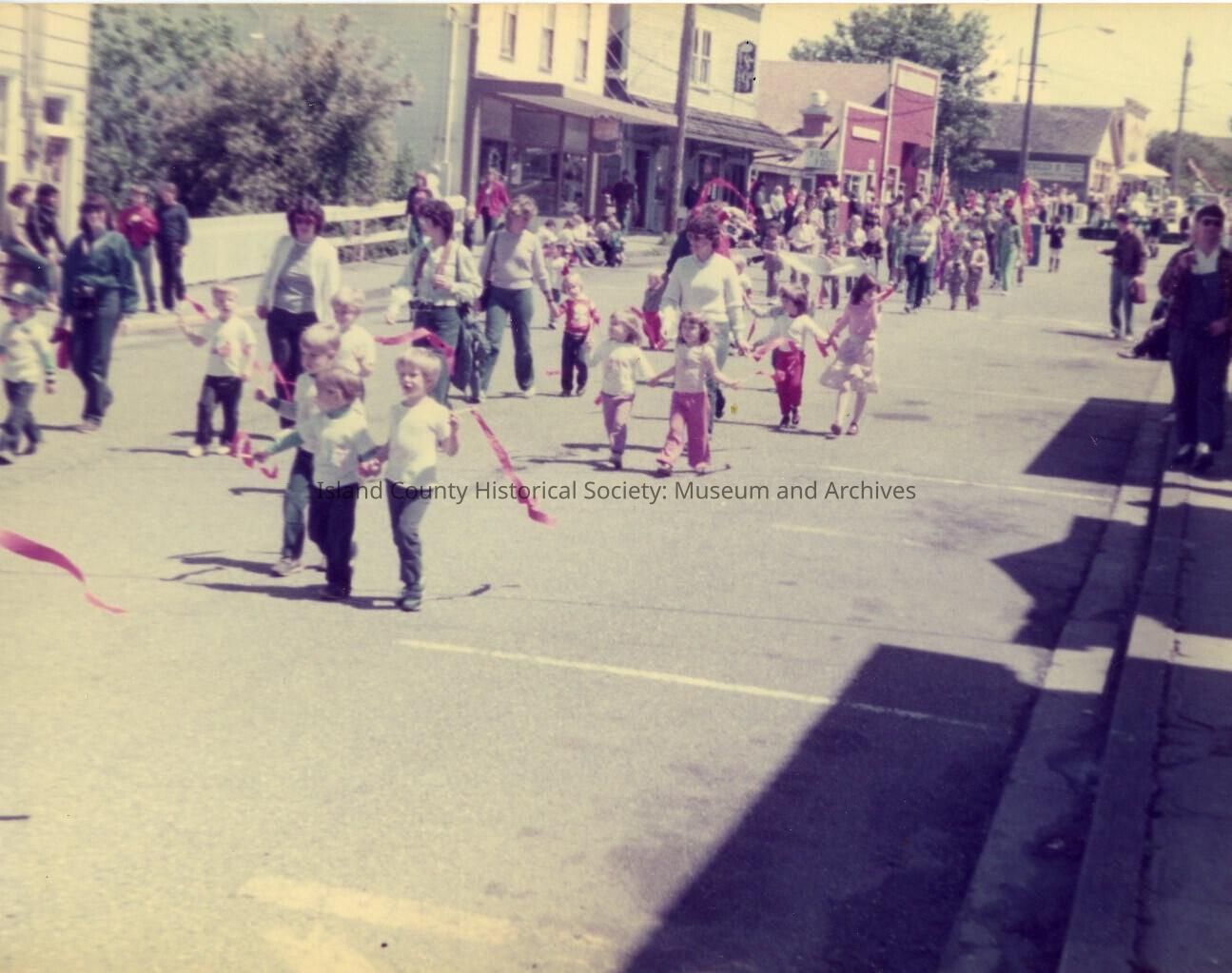 Parade in Coupeville, dozens of children with adults walking down the Front St. in Coupeville.