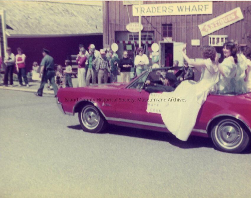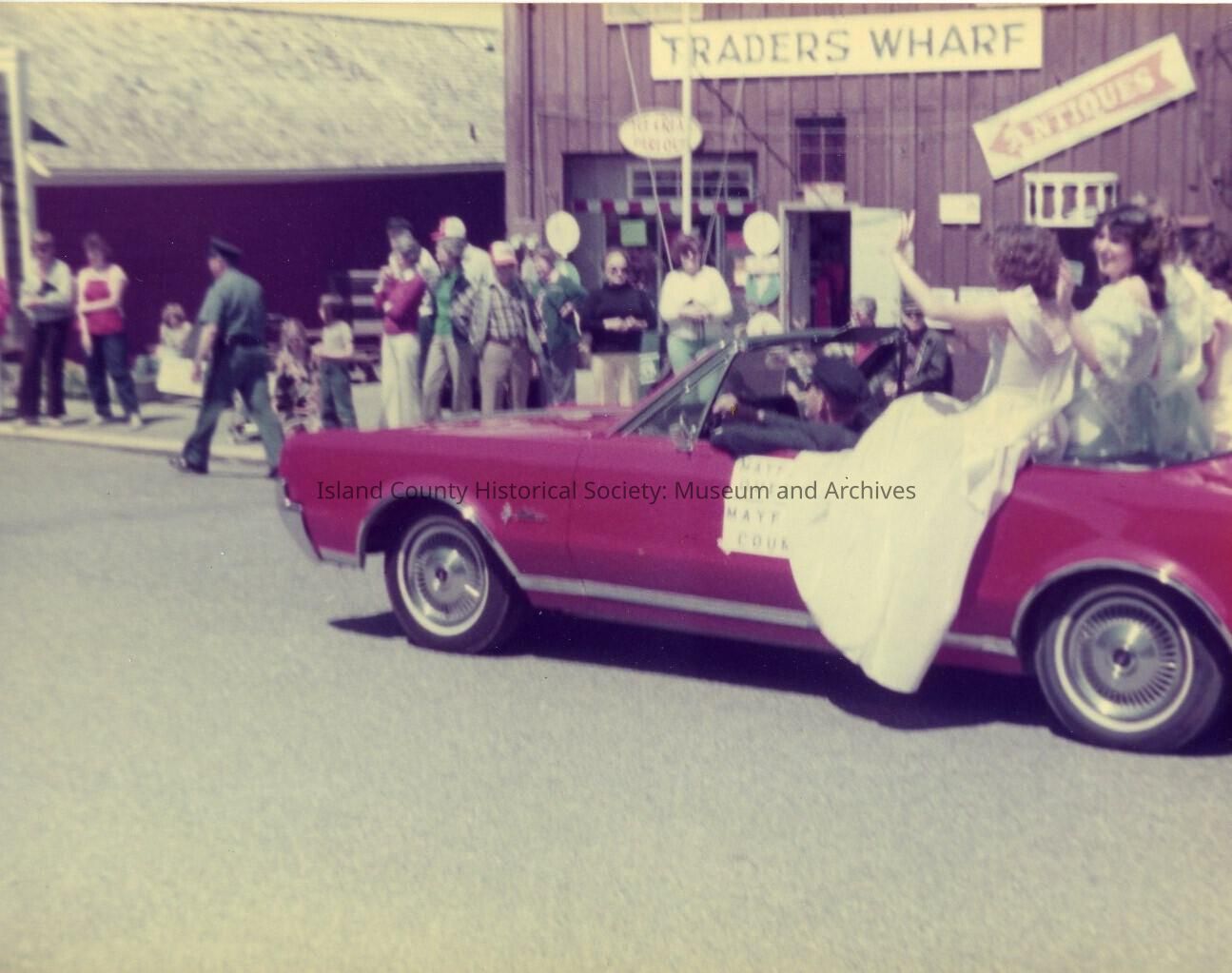 Parade in Coupeville a red convertable car with three women sitting on the back. Several spectators standing on the side of the road.