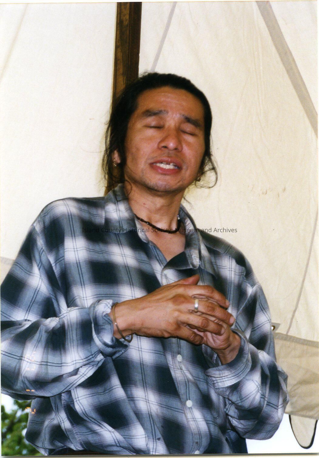 May 17, 2004 Coupeville Water Festival. Johnny Moses (Xwistimani) of the Samish Nation wearing a plaid shirt either singing or telling a story. His eyes are closed and holding his hands close to his chest.