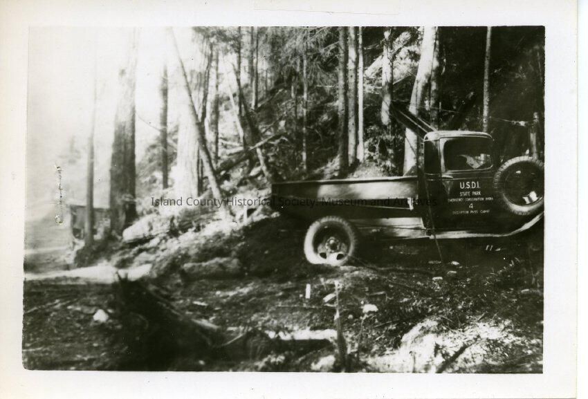 This black and white photo shows a behind the scenes look at the construction of the Deception Pass bridge. On the right of the photo there is a truck that is dumping dirt onto the ground and in the background are trees.