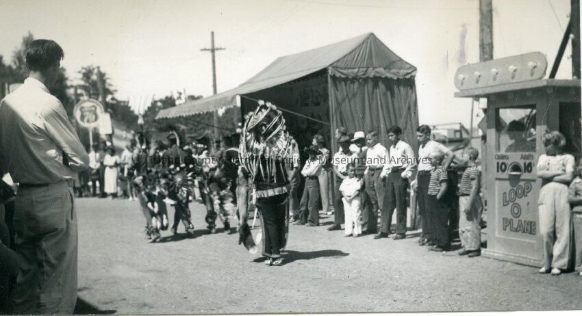 Photo water festival in Coupeville. People are standing on both sides of the street watching the parade. Union 76 sign in the background. Native Americans in ceremonial dress are in the parade. On the back: *Main Street Aug 9-10-11