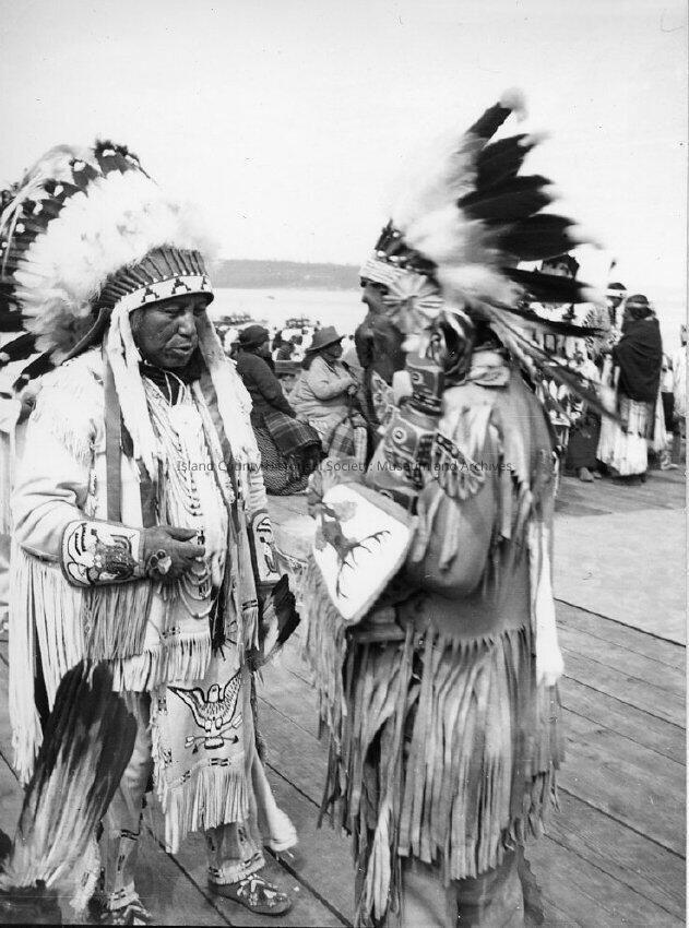 Coupeville Water Festival circa 1930 Two Native American men in traditional clothing and large headresses talking to eachother.